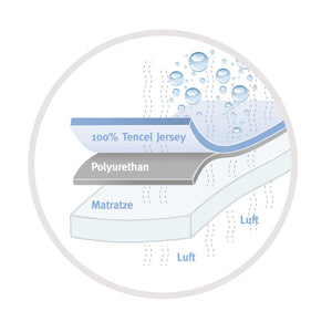 Der Bezug besteht aus Tencel Feinjersey mit einer Beschichtung von Polyurethan- Feingewebe.