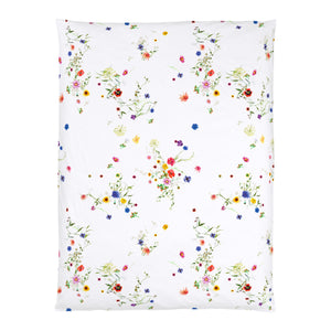 Die Bettwäsche "Fleurs Volantes" von Christian Fischbacher bringt eine schöne Blütenpracht ins Schlafzimmer. Dahlien, Zinien, zarte Cosmaea und blaue Kornblumen zieren die strahlend weisse Bettwäsche.